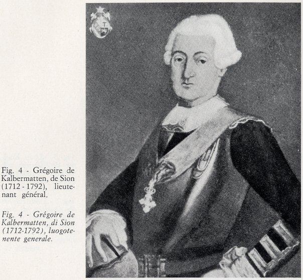 Provenienti da Sion, nel Vallese, dove ancora oggi c’è la residenza di famiglia costruita proprio da Grégoire e detta la Prefecture, visto che nel periodo napoleonico qui vi era installata la Prefettura del Cantone, i Kalbermatten vennero nobilitati da Luigi XIV nel 1712, negli archivi privati della famiglia sono ancora oggi conservate le patenti di nobiltà siglate da Colbert e lo stemma firmato dal Re Sole che riporta i colori famigliari l’azzurro e il giallo che ritroviamo nelle uniformi del Reggimento.