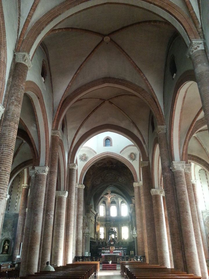 L’interno, con planimetria a tre navate, ampio tiburio ottagonale e coro molto profondo, è stato riportato in epoca recente alla purezza delle linee originarie, che vedono prevalere, rispetto alla Cattedrale, maggiormente improntata agli slanci ascensionali dell’architettura d’Oltralpe, la dimensione orizzontale propria delle chiese d’area padana.