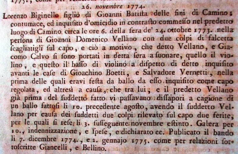 Questa storia inizia a Camino, paese del Monferrato, nella serata del 24 ottobre 1773, quando nella casa di Gioachino Boetti si sta svolgendo una festa da ballo, diretta da Lorenzo Biginello.